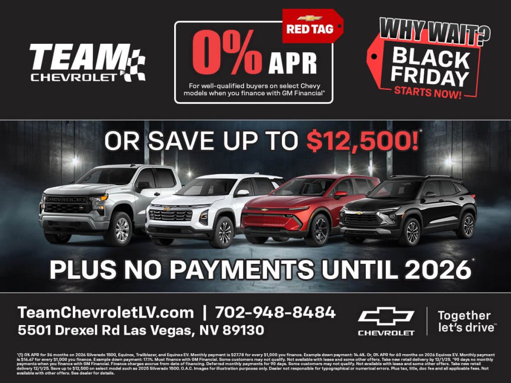 The biggest savings event of the year is here at Team Chevrolet, Your Hometown Team in Las Vegas, NV! This Black Friday, we’re bringing you deals you won’t want to miss — including 0% APR on select new Chevrolet models*, up to $12,500 off*, and no payments until 2026!*