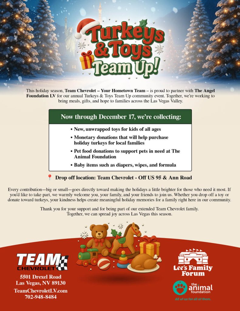 This holiday season, Team Chevrolet – Your Hometown Team – is proud to partner with The Angel Foundation LV for our annual Turkeys & Toys Team Up community event. Together, we’re working to bring meals, gifts, and hope to families across the Las Vegas Valley.